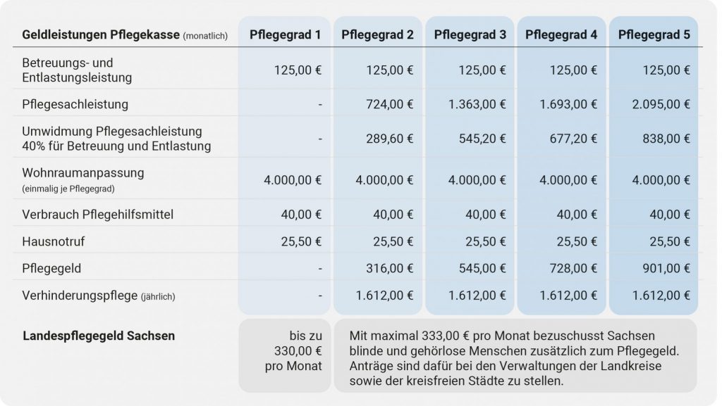 Blinde und gehörlose Menschen erhalten im Freistaat Sachsen zusätzlich zum normalen Pflegegeld noch das Landespflegegeld. Die maximale Höhe beträgt 333 Euro pro Monat. Anträge dazu stellen Pflegebedürftige bei den Verwaltungen der Landkreise bzw. der kreisfreien Städte Leipzig, Chemnitz, Dresden.